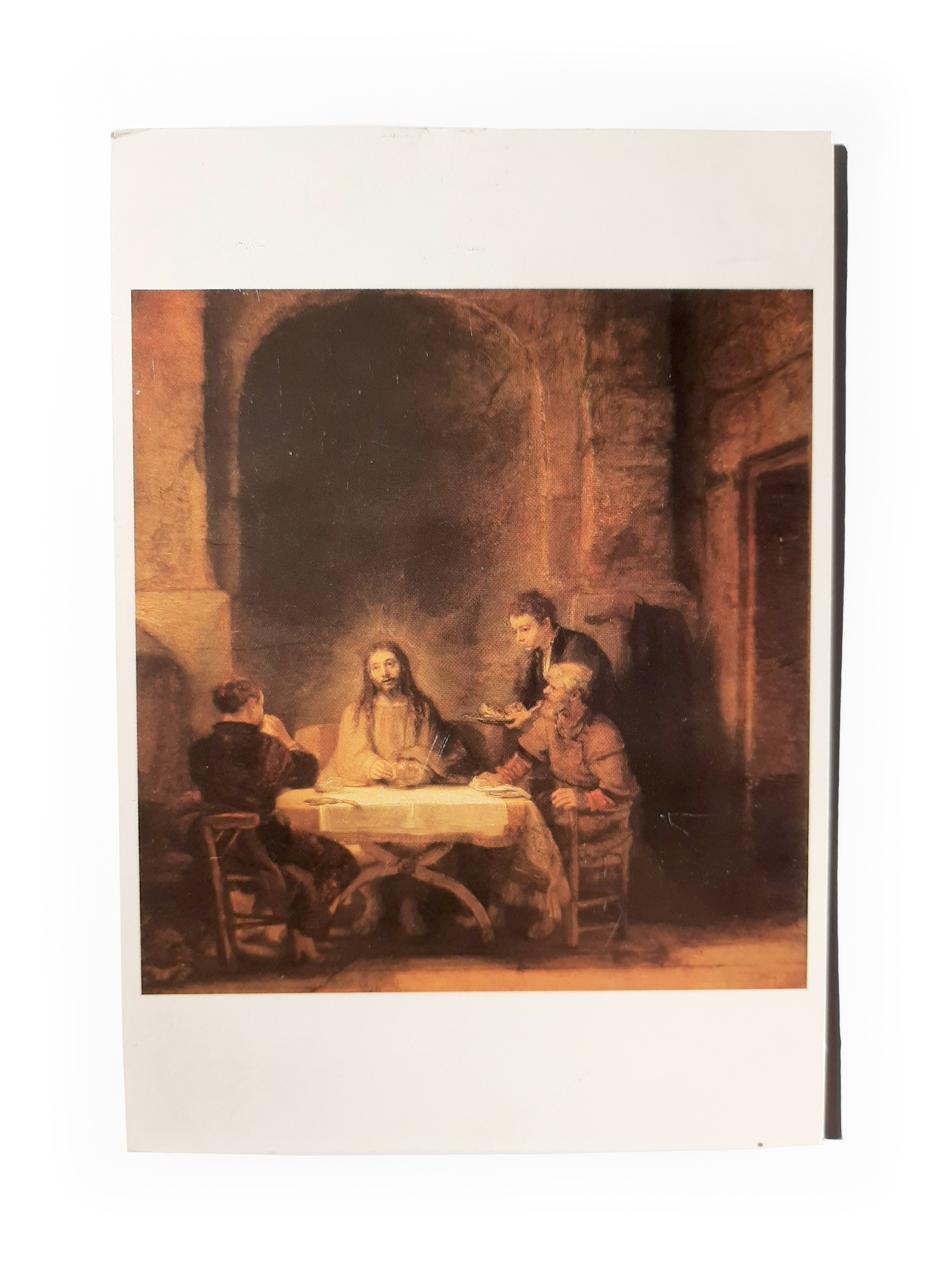 Ik kan het interieur van mijn oma in haar sociale huurwoning nog tot in detail uittekenen. Met de donkergroene velours gordijnen, het imitatie Perzisch tapijt op tafel en het dressoir in Louis quartorze stijl. Boven het dressoir hing een reproductie van dit huiselijke schilderij van Rembrandt: Jezus aan tafel, te midden van de Emmausgangers, precies op het moment dat hij wordt herkend en verdwijnt.