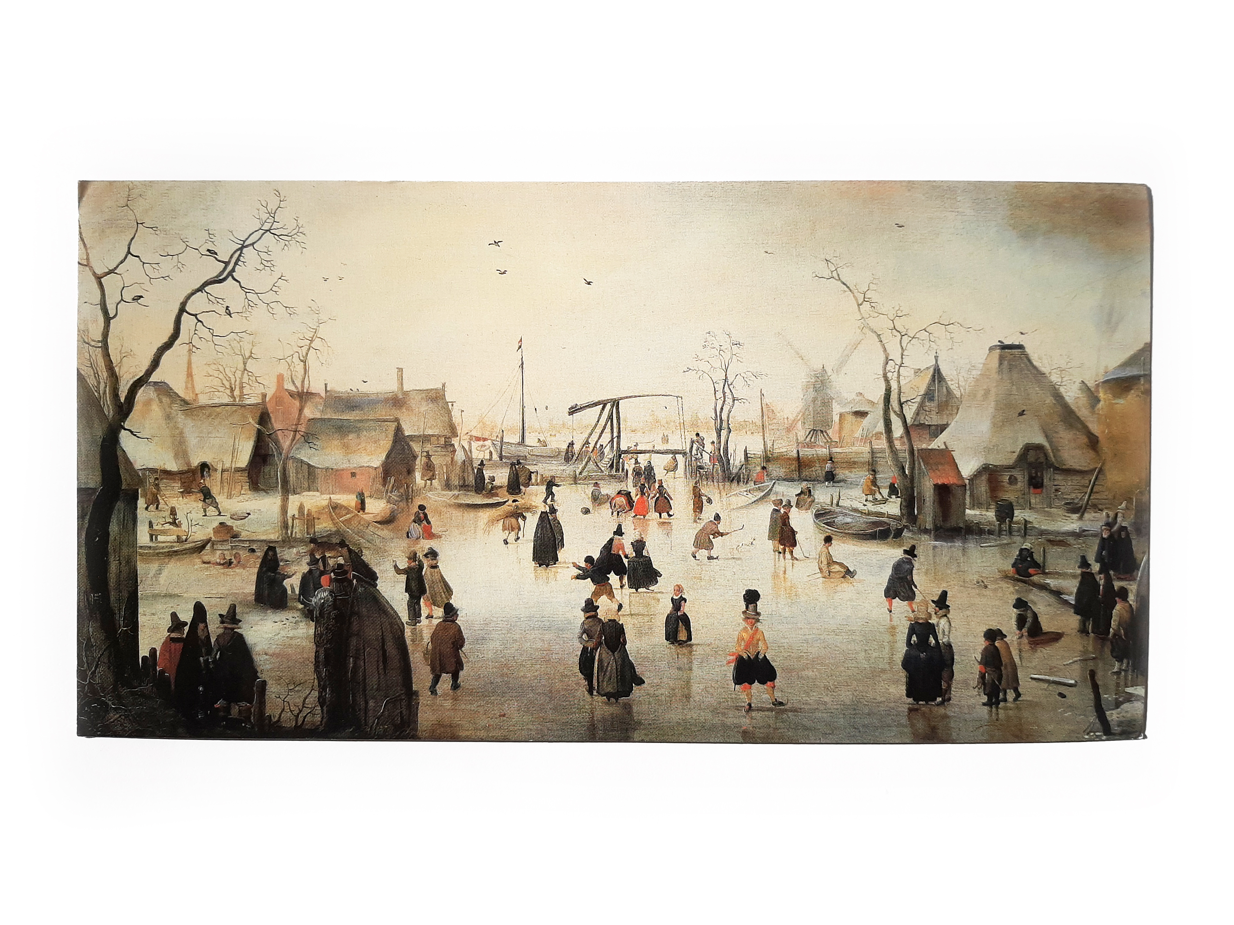 Dit is zo’n typisch schilderij om eens lekker lang naar te kijken, omdat er zo veel te zien is. Je ziet mensen ijshockeyen, sleeën, schaatsen. Links is een groepje door het ijs gezakt, vlak voor de brug is een dame voorover gevallen en zie je blote billen. Op dit schilderij zie je de gekte die zich van Hollanders meester maakt als het vriest.