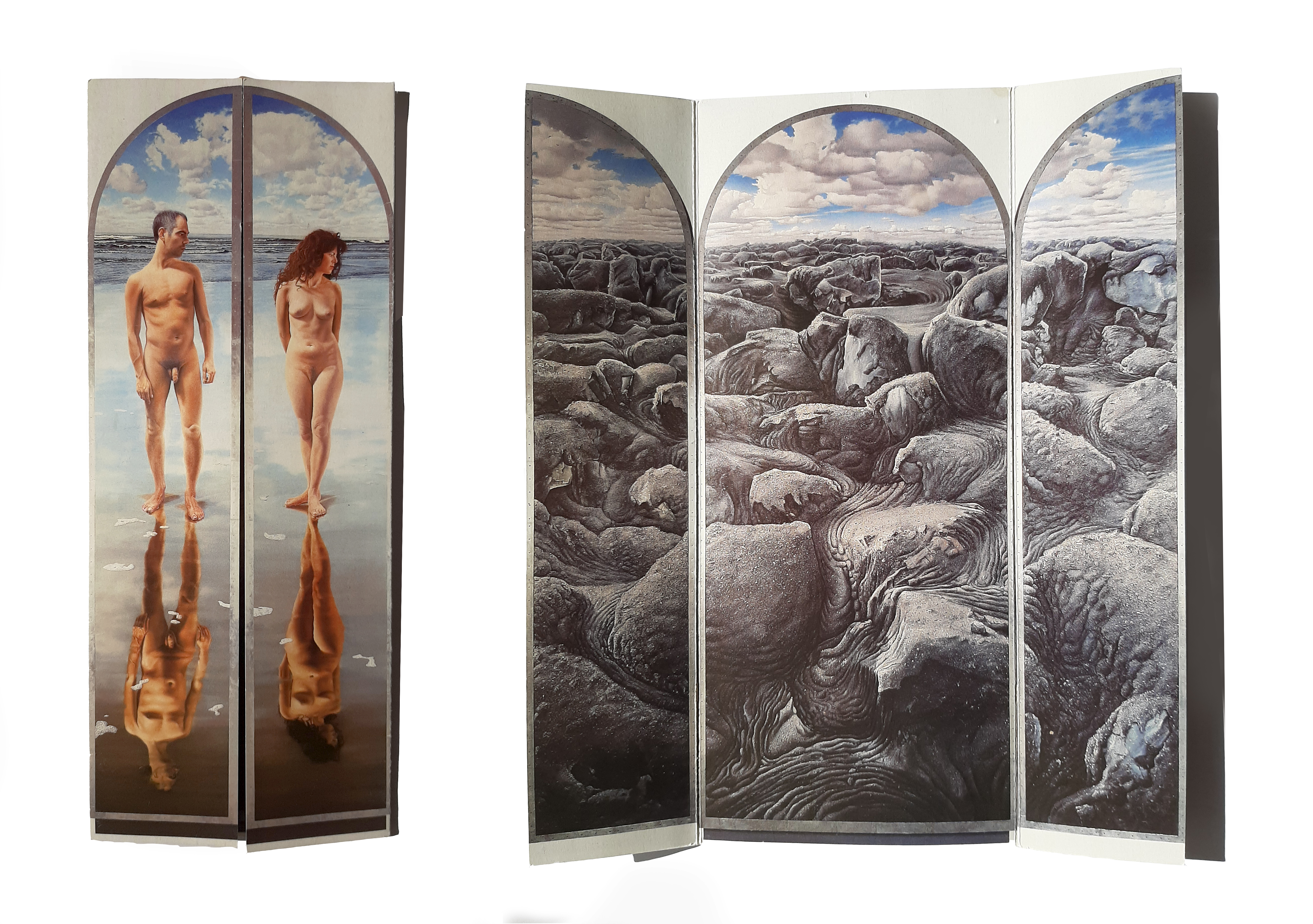 De schilder Johnny Beerens weet dit landschap op een fantastische manier te vangen. Dit ‘Genesis Triptiek’ zag ik in 2001 in de Lutherse kerk van Nieuwvliet. Het is gigantisch: de man en vrouw én hun spiegeling in het water, zijn levensgroot. Het beeld van geasfalteerde basaltblokken aan de binnenkant van het triptiek is opgeblazen tot enorme proporties, als een oneindige bergketen. Beerens verwerkte zand in de verf voor extra plastiek.